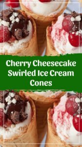 Creamy cherry cheesecake ice cream swirled into a crunchy cone. The perfect no-bake summer dessert! Easy recipe, homemade ice cream, cherry dessert, frozen treat, cheesecake swirl.